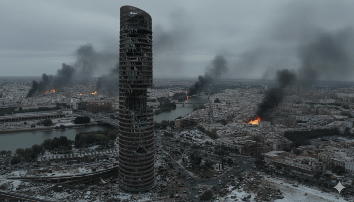 La Giralda bajo un cielo en llamas, la Plaza de España reducida a ruinas o el Torre Sevilla transformado en una fortaleza asediada. No hablamos de un rodaje en la ciudad, sino de un experimento creativo en el que la inteligencia artificial convierte a Sevilla en un escenario de película bélica.